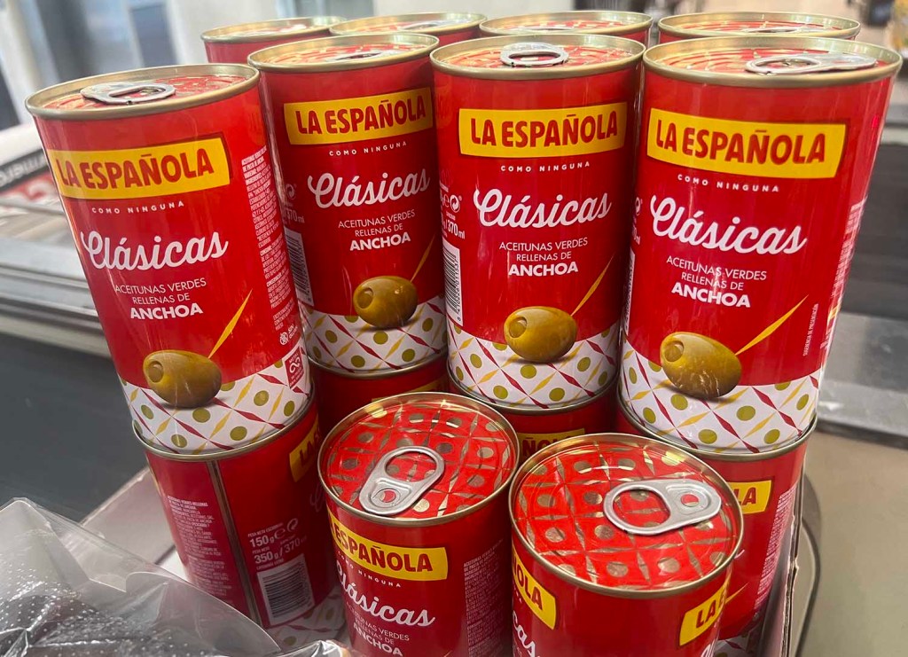 While San Geraldo and I were out the other evening (after our pre-dinner ice cream when we both had mango and dark chocolate), we dropped by the supermarket to pick up a couple of things. At the register was a display of what I at first thought were cans of Campbell’s soup. But it was olives (stuffed with anchovies).