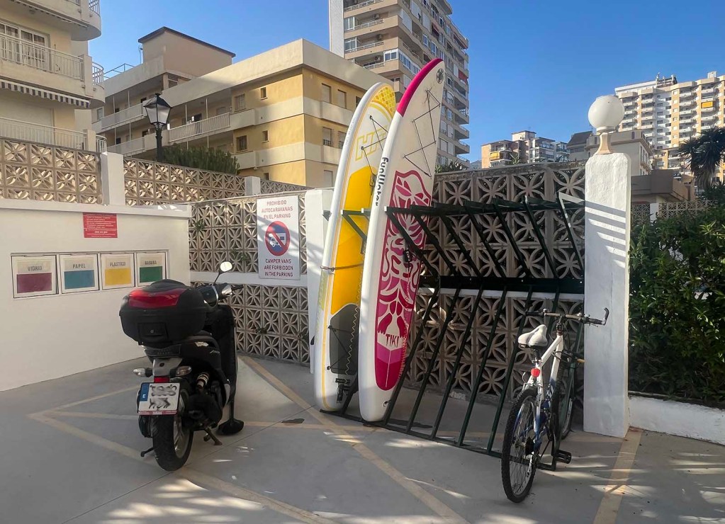 El otro día, notamos que se estaban realizando obras en nuestro estacionamiento. Parecía que estaban instalando un nuevo portabicicletas. Comenté con sarcasmo la poca necesidad que teníamos de una nueva carrera de bicicletas, ya que nunca vemos más de dos o tres bicicletas allí, cuando hay tantas otras cosas por hacer. Resulta que era una combinación de portabicicletas y tablas de surf. Ahora entiendo.