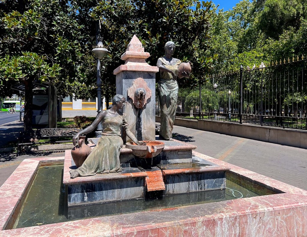 • Magnolia grandiflora con vainas, al fondo a la izquierda. Nunca me canso de esta fuente junto a los Jardines de Colón (también conocidos como Jardines de la Merced, por el palacio de enfrente).