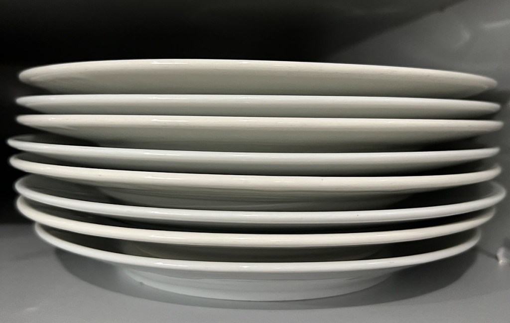 • Compramos una vajilla blanca cuando llegamos a España hace más de 14 años. Unos años después, quisimos renovarla y compramos varios platos más para pan, ensalada y pastel de la misma línea, solo para descubrir al llegar a casa que el color era diferente. La diferencia es mínima y realmente no nos importó. El único problema es cuando vacío el lavavajillas. Apenas puedo controlar mi necesidad de escalonarlos: blanco, blanquecino, blanco, blanquecino. A veces varío con múltiplos de uno u otro. Entonces se rompió un plato. Lo recogí al cambiarlo y era más pequeño que todos los demás. Colocarlo al final de la pila. Sé que algunos de vosotros tendríais el mismo problema.
