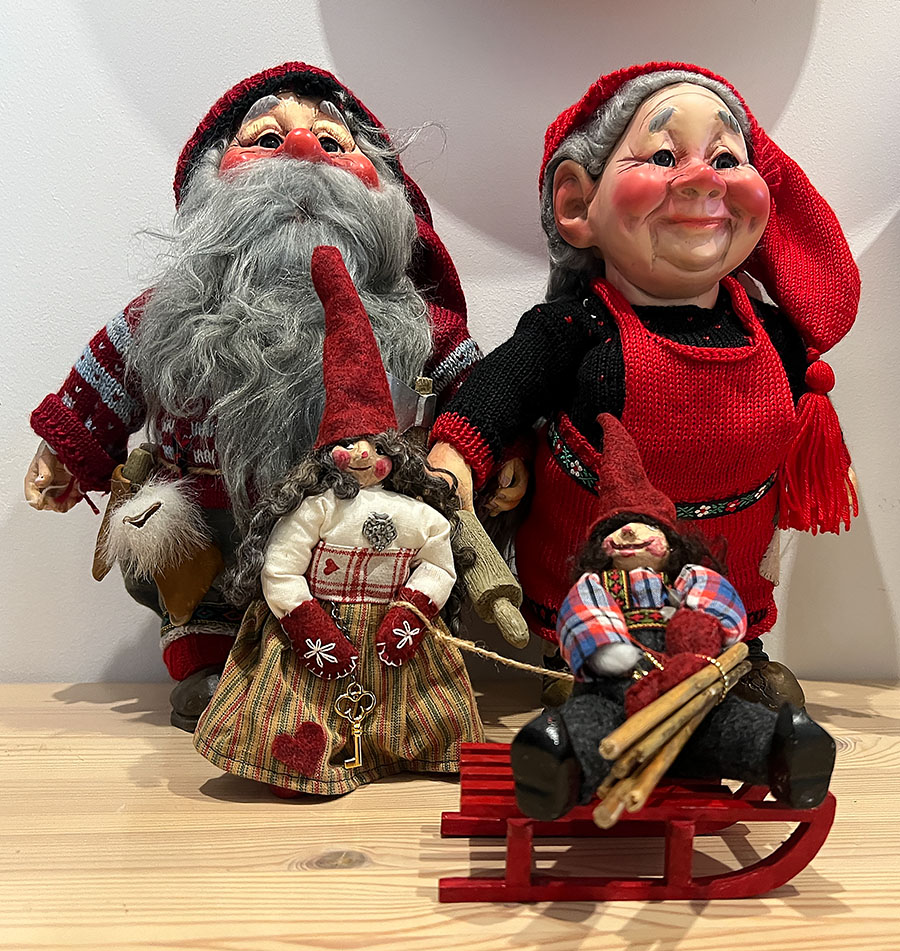 • Los nisse son criaturas mágicas parecidas a gnomos de Noruega. Los Julenisse son nisse navideños. Compramos los grandes en Bergen en 1998. Los pequeños los hizo a mano para nosotros la prima de Jerry, Ellen, de Bergen. Se supone que nos protegen y nos traen regalos. Y les encantan las gachas.
