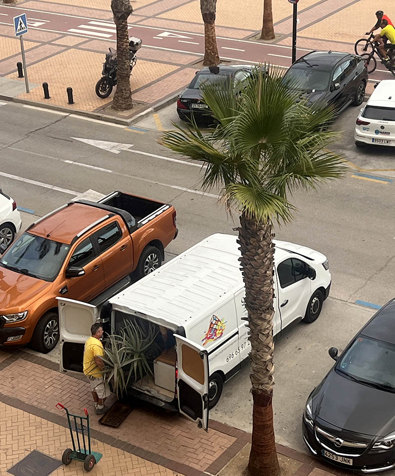 Santi y Yoshua (haz clic aquí) recogieron el resto de las macetas de la terraza, un armario de almacenamiento y las dos grandes macetas de aloe vera. Esperaba oír gritos, pero ninguno de ellos fue apuñalado. El aloe vera siempre me ataca. Afortunadamente, tiene su propio plan de tratamiento incorporado. Los tipos también se llevaron toda la basura que había que tirar. Les estamos muy agradecidos. Parece que nos vamos a mudar.