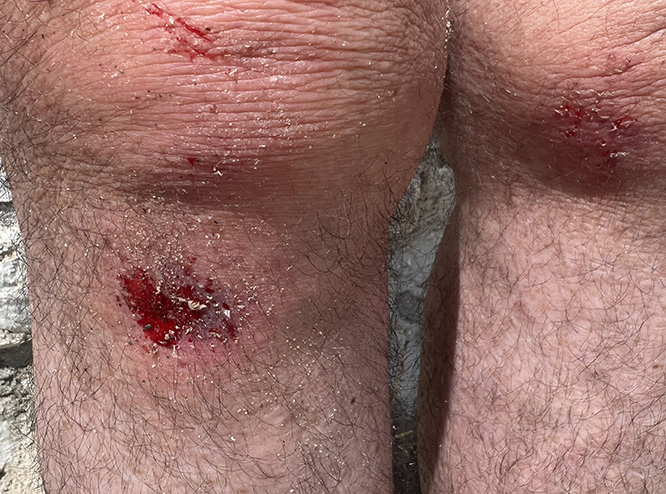 I inspected my own damage without appreciating how extensive it was. I had at least a half hour walk home having actually reached the end of the Paseo this time. I considered phoning San Geraldo but didn’t. (Oh, yes, I heard about that.) Figuring if I sat down at any point, the soreness would kick in, I headed home (walking first along the beach to avoid the steps and wall) stopping only briefly half way at a chiringuito toilet where I dabbed some of my wounds with a wet paper towel. I still had no idea what a mess I was. I’m not as sore today as I expected to be.