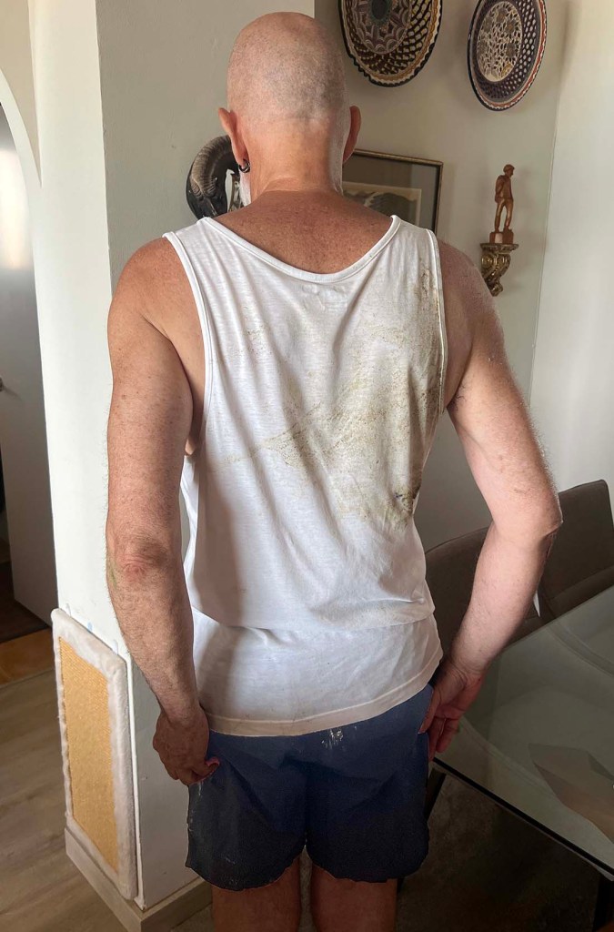 Inspeccioné mis propios daños sin apreciar cuán extensos eran. Tuve que caminar al menos media hora hasta casa, habiendo llegado esta vez al final del Paseo. Pensé en llamar a San Geraldo pero no lo hice. (Oh, sí, escuché sobre eso). Pensando que si me sentaba en algún momento, el dolor aparecería, me dirigí a casa (caminando primero por la playa para evitar los escalones y la pared) y me detuve solo brevemente a mitad de camino en un chiringuito. baño donde me sequé algunas de mis heridas con una toalla de papel mojada. Todavía no tenía idea del desastre que era. Hoy no estoy tan dolorido como esperaba.