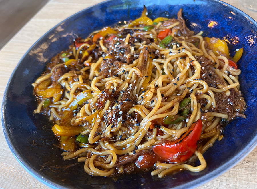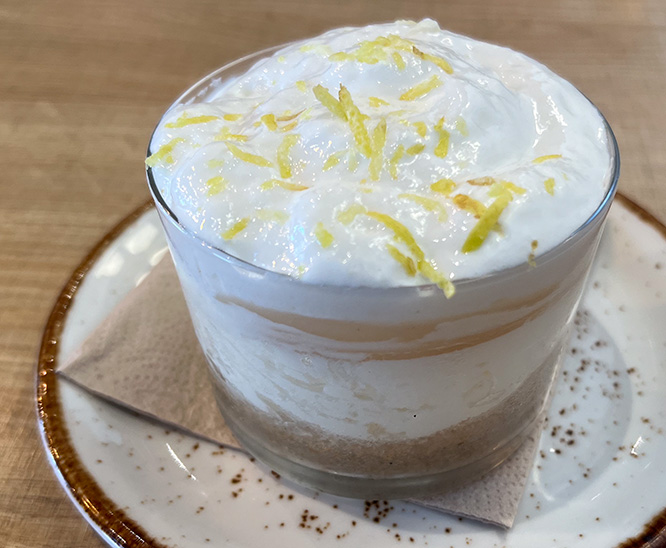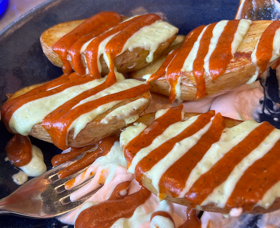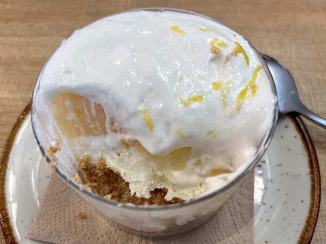• Phenomenol, I was told. For some reason, I didn’t want any but the others shared. San Geraldo loves patatas bravas and said this was the best sauce he ever had. • Fenomenal, me dijeron. Por alguna razón, no quise ninguna, pero los demás compartieron. A San Geraldo le encantan las patatas bravas y dijo que esta era la mejor salsa que había probado en su vida.• Chicken tacos • Tacos de pollo.• Noodles with bull’s tail. (They called them noodles in Spanish, too.) • Noodles de rabo de toro.• Lasagna with garlic shrimp. • Lasagna de gambas ajillo.• Called lemon and meringue pie (they called it pie in Spanish, too, which is odd because pie means foot). • Se llama pie de limón y merengue. No tenía sabor a pies.• Interesting. • Interesante. • Maureen is equal parts mother and goddess. What a family! • Maureen es a partes iguales madre y diosa. ¡Que familia!• The dildo was never found. • El consolador nunca fue encontrado.