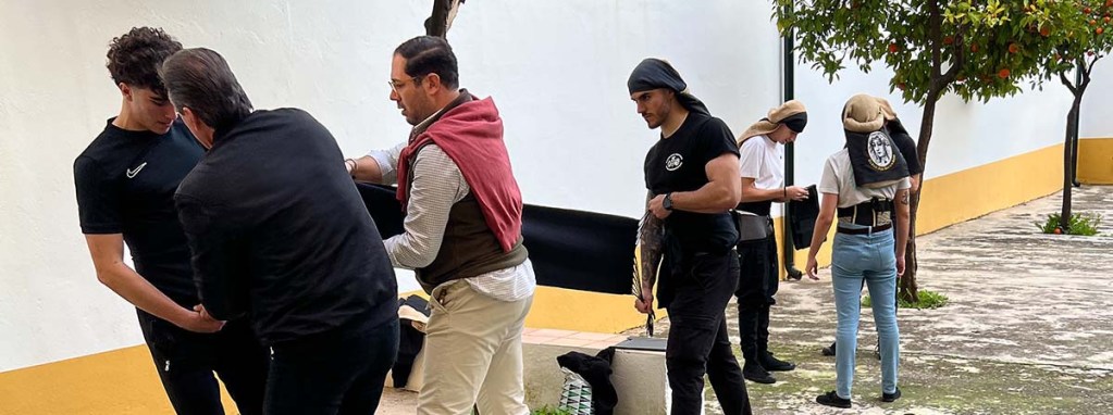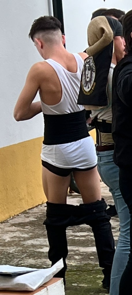 Costaleros are the men who carry the holy statues through the streets during Semana Santa and other special days, and I just happened to visit the church grounds when a very large group of costaleros were getting suited up to practice carrying their paso.