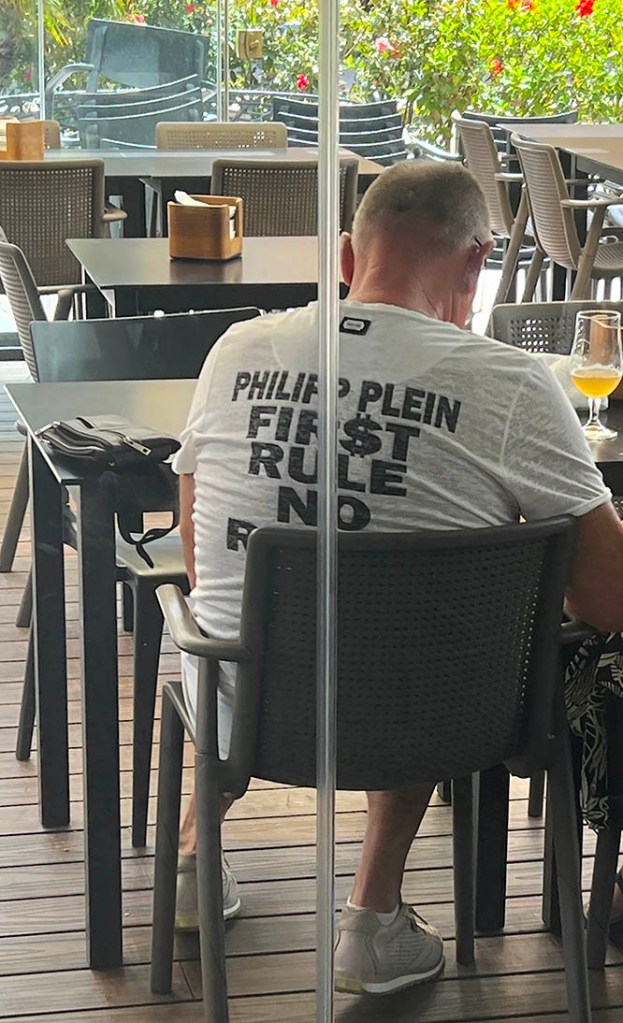 • PHILIPP PLEIN, PRIMERA REGLA, NO HAY REGLAS. No la vi de frente. Podría tener una enorme impresión de un billete de dólar y una calavera, o tal vez una chica en bikini sobre una serie de billetes de dólar. Puedes encontrar camisetas auténticas (como esta si es auténtica) por tan solo 180 €, rebajadas de su precio original de 800 €. Avísame y te ayudaré.