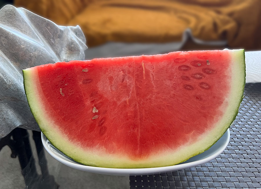 The top photo is a watermelon San Geraldo purchased yesterday. I dropped it in that bowl without thinking. A perfect fit. A bit too perfect, but it didn’t get stuck. Have you ever had cotton candy (candy floss) grapes? They’re delicious and taste a lot like cotton candy. Also fine for diabetics. But if I’m confessing all, I did have Ines Rosales tortas (click here) after lunch. This time, San Geraldo called them Tito Puente (click here).