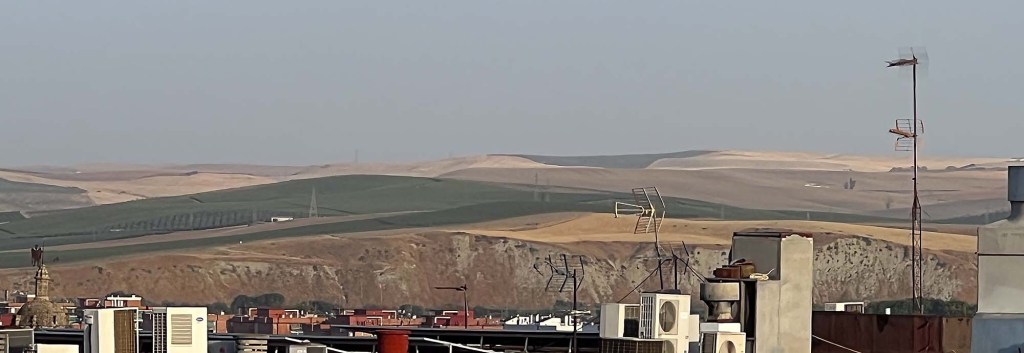 • Una vista hacia el sur desde la azotea, de la ciudad y del río, en un día nublado. Nuestro edificio tiene siete pisos, que creo que es el límite en la ciudad.