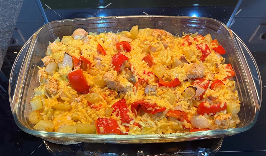 • San Geraldo probó una nueva receta anoche: Cazuela de pollo y papas al horno con pimientos rojos. ¡Delicioso! Nos sobró para el almuerzo.